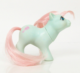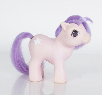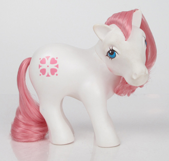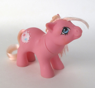 Sundance is a white adult earth pony with pink hair and blue eyes. Her symbol is a pink tracery pattern including four symmetrical heart shapes. She is in the Bow-Tie Pose. Sundance came in a box with Megan and several accessories. In later years, the Megan and Sundance set was re-released in two different variations.