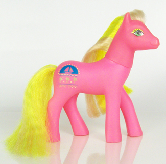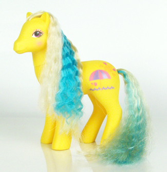 Sundazzle Ponies were printed in Year 10, between 1991 and 1992. They have bright-colored bodies, symbols, and hair, much like the Tropical Ponies and the Rockin' Beat Ponies of Years 8 and 9, and they also have color-changing strips in their manes like the Sunshine Ponies of Year 7, though their tails do not change color. They were made in Sweetheart Sister Pony poses, and like the Sweetheart Sisters they wear eyeshadow, but they do not wear earrings like the original Sweetheart Sister Pony sets. Each Sundazzle Pony came with a sun pick.